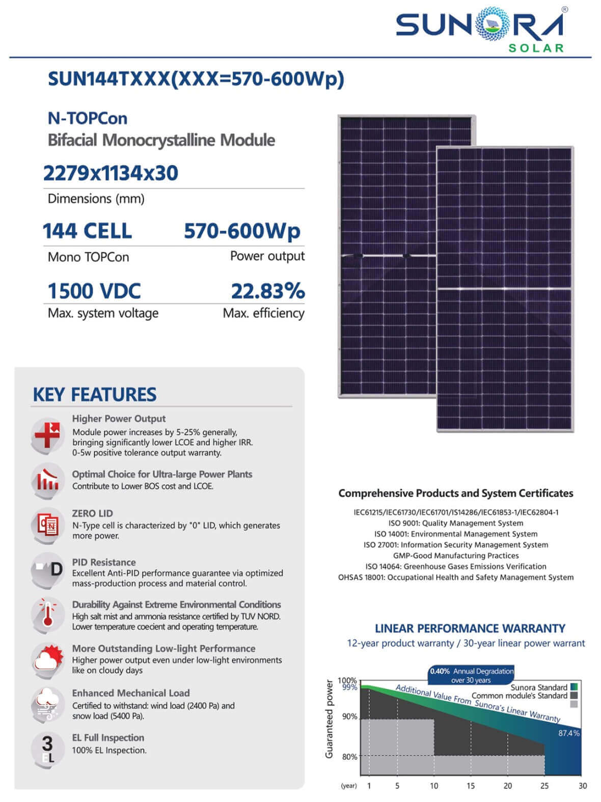 Sunora 600Wp 144Cells N-TOPCon Bificial Module